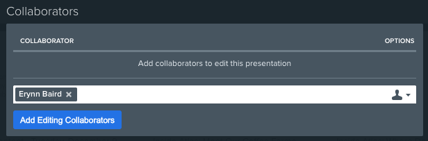 To add collaborators to a presentation, click into the SHARE button and select the users you want to collaborate. The collaborators will be notified by email.